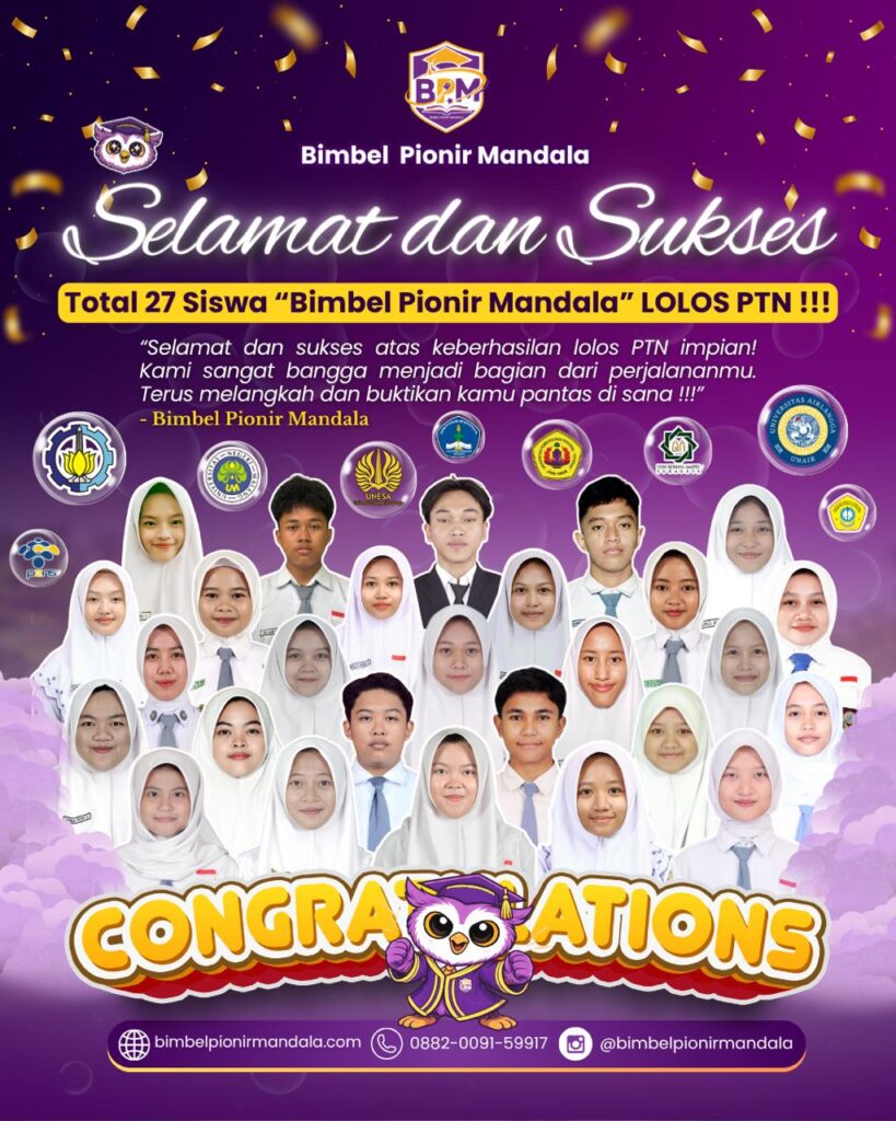 Prestasi membanggakan kembali ditorehkan oleh Bimbel Pionir Mandala. Pada tahun 2026, sebanyak 27 siswa berhasil lolos ke berbagai Perguruan Tinggi Negeri (PTN) melalui jalur Seleksi Nasional Berdasarkan Prestasi (SNBP). Pengumuman hasil SNBP 2026 resmi dirilis pada Selasa, 31 Maret 2026, pukul 15.00 WIB, menjadi momen penuh haru dan kebanggaan bagi seluruh siswa, orang tua, serta civitas akademika Bimbel Pionir Mandala. Keberhasilan ini merupakan refleksi dari dedikasi tinggi para siswa dalam menempuh proses pembelajaran, serta hasil dari pembinaan akademik yang terarah dan berkelanjutan. Capaian Akademik yang Membanggakan Para siswa yang dinyatakan lolos SNBP 2026 berhasil menembus sejumlah PTN favorit di Indonesia. Capaian ini menunjukkan kualitas akademik yang unggul serta kesiapan siswa dalam bersaing di tingkat nasional melalui jalur seleksi berbasis prestasi. Keberhasilan ini tidak terlepas dari konsistensi belajar, disiplin tinggi, serta strategi pembelajaran yang efektif yang diterapkan selama masa bimbingan. Sinergi Siswa, Orang Tua, dan Pengajar Pencapaian ini merupakan hasil kolaborasi yang solid antara siswa, dukungan penuh dari orang tua, serta dedikasi para pengajar yang senantiasa memberikan pendampingan terbaik. Bimbel Pionir Mandala percaya bahwa keberhasilan siswa tidak hanya ditentukan oleh kemampuan akademik semata, tetapi juga oleh lingkungan belajar yang kondusif dan motivasi yang terus terjaga. Apresiasi dan Ucapan Selamat Manajemen Bimbel Pionir Mandala menyampaikan apresiasi setinggi-tingginya kepada seluruh siswa yang telah berhasil meraih hasil terbaik. “Selamat dan sukses atas keberhasilan dalam menembus PTN impian melalui jalur SNBP. Kami bangga dapat menjadi bagian dari perjalanan akademik kalian. Teruslah berkembang, berprestasi, dan memberikan kontribusi terbaik bagi masa depan.” Komitmen terhadap Kualitas Pendidikan Sebagai lembaga bimbingan belajar yang berorientasi pada hasil dan kualitas, Bimbel Pionir Mandala senantiasa berkomitmen untuk menghadirkan sistem pembelajaran yang inovatif, adaptif, dan relevan dengan kebutuhan seleksi nasional. Program pembelajaran dirancang secara sistematis, mencakup penguatan konsep, latihan intensif, serta evaluasi berkala guna memastikan kesiapan siswa dalam menghadapi berbagai jalur seleksi masuk PTN.